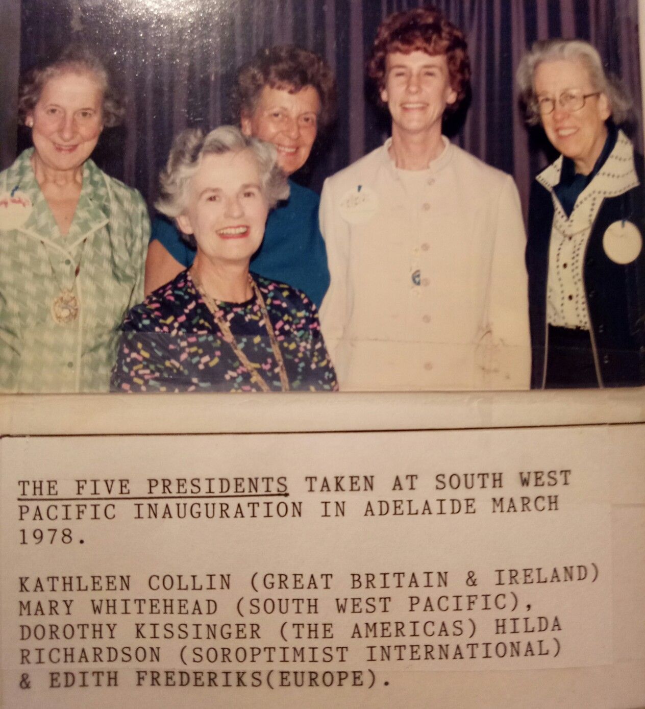 A Charter organising committee representing each club was set up under the chairmanship of Olive Johnson, there were to be many overseas guests including the International President Hilda Richardson, along with SIGBI President Kathleen Collin, President SI Americas Dorothy Kissinger, President SI Europe Dr Edith Frederiks. At the official charter dinner on the 24th of March 1978, at the Conference of the Council of the South West Pacific in Adelaide South Australia, Her Excellency, (Australian High Commissioner to Nauru) Maris King, M.B.E. received the regalia of the Office of President of Soroptimist International of the South West Pacific from Soroptimist International President Hilda Ritchardson. Each member at the dinner was presented with a name tag with an Australian wildflower hand painted by Vera Bates, and the menu featured a Hans Heysen print on the cover. At the ceremony was a parade of flags of the countries involved, and a parade of Soroptimists representing significant landmarks leading to the Federation.