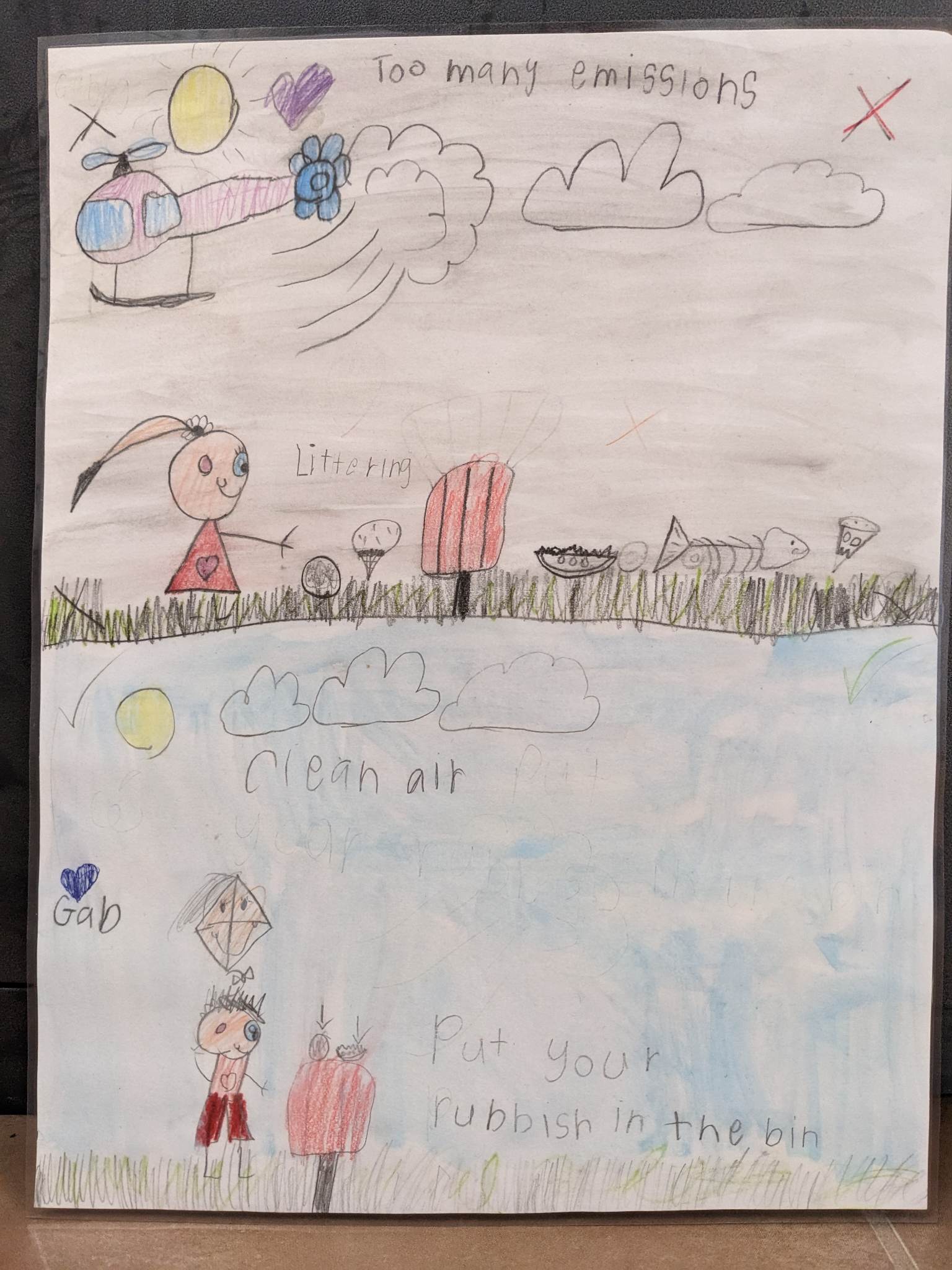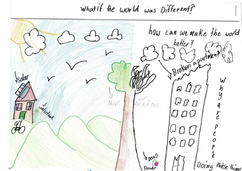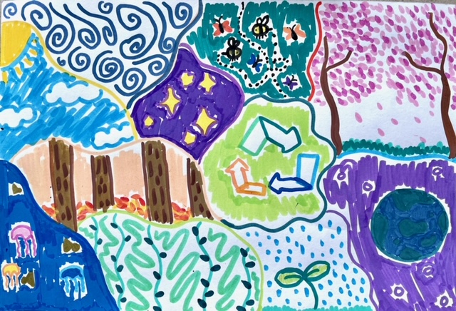 Charis writes, "This artwork is what I want for the future world. I want it to be more eco friendly so that the ocean is less polluted (with Jelly fishes around), new plants will be able to sprout (sprouting plant in the rain). We can have a clear sky (white cloud in the blue sky, less light pollution so that we can see the stars at night. We will be able to have fresh air to breathe (the blue swirl in the drawing. Minimize the use of pesticides so that bees and bugs can help pollinate the plants. We will have a beautiful nature scenery through the seasons (cherry blossom, green vines, autumn leaves). Therefore we should reduce, reuse and recycle to save our world now. "