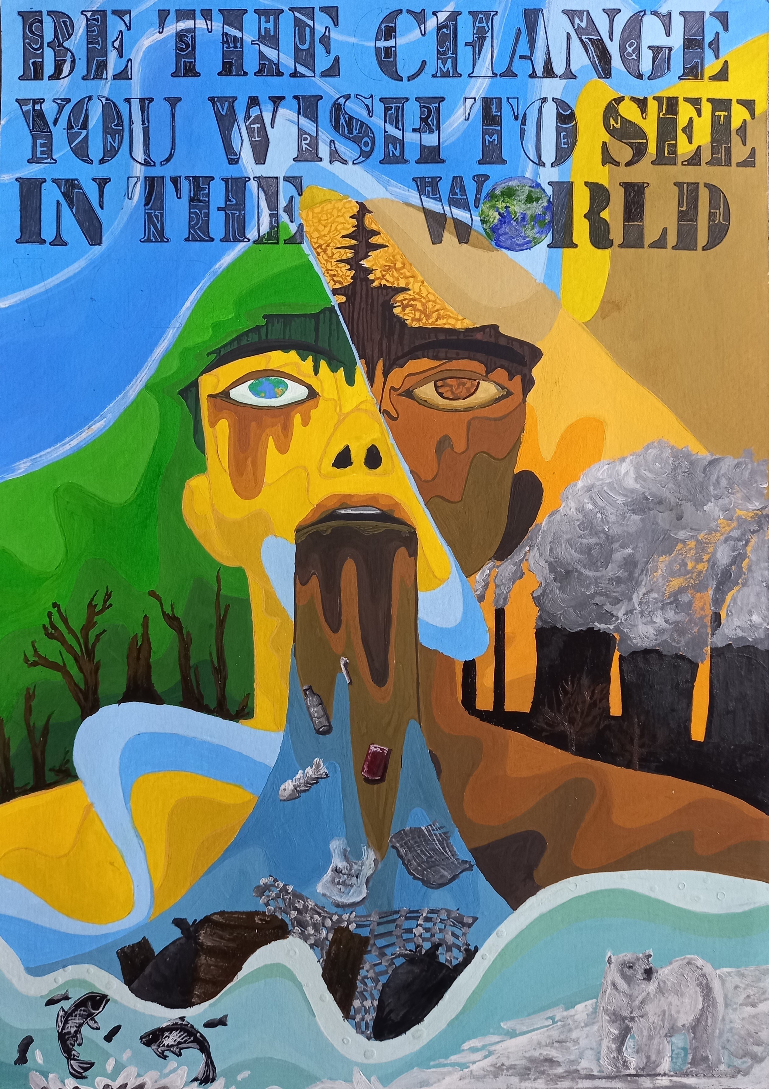 Using a wavy art style reminiscent of water, wind, and sound, this artwork portrays two contrasting environments. On the left, there's the thriving tree, while the right side represents a polluted setting, with air pollution and rising temperatures. As temperatures soar, drought becomes evident, manifesting as cracks on the figure's head. Below, a polar bear underscores the impact of melting ice on its habitat. The water emerging from the figure's mouth appears dirty, with floating debris—an unsettling reminder of the widespread issue of microplastics in our food, resulting from irresponsible human actions. Overall, the central female figure symbolizes both Mother Nature's resilience and the strength to fight for her rights. Nature too will fight for itself, and the consequences of our actions will inevitably return to us.